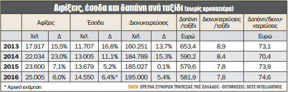 Οι πρώτες ενδείξεις, πάντως, λένε πως την παρούσα σεζόν αναμένεται μικρή μόνο μείωση στα έσοδα, το πολύ 2%, σε σύγκριση με πέρσι, αντί για 6% που αρχικά είχαν προβλέψει οι επιχειρηματίες του κλάδου. Έτσι, αν και στην αρχή της σεζόν οι επιχειρήσεις προέβλεπαν πως τα τουριστικά έσοδα θα έφταναν τα 15 δισ. ευρώ, από 14,2 δισ. το 2015, ο πήχης δείχνει να κατεβαίνει, παρά το γεγονός πως ο αριθμός των τουριστών αυξάνεται και μάλλον θα επιτευχθεί ο στόχος των 25 εκατ. αφίξεων.
