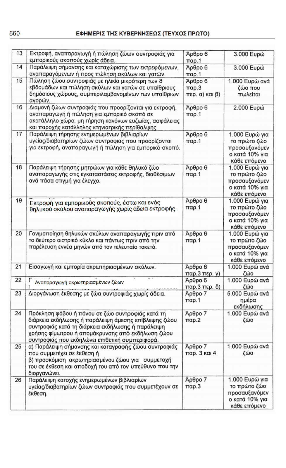 «Όταν εκτρέφεται έστω και ένας θηλυκός σκύλος αναπαραγωγής για εμπορικούς σκοπούς απαιτείται υποχρεωτικά η έκδοση άδειας εκτροφής, αναπαραγωγής και εμπορίας ζώων συντροφιάς. Άδεια εκτροφής, αναπαραγωγής και εμπορίας ζώων συντροφιάς απαιτείται και για τους ερασιτέχνες εκτροφείς σκύλων ή γατών όταν συντρέχουν οι προϋποθέσεις του προηγούμενου
