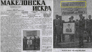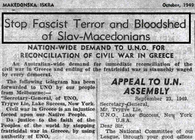 Η εφημερίδα των Σλαβομακεδόνων της Αυστραλίας σε διαμαρτυρία για ειρήνη στον ελληνικό εμφύλιο πόλεμο σε πλακάτ παρουσιάζονταν ως Slav Macedonians- Σλάβοι της Μακεδονίας |